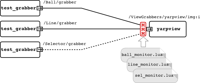 The connection from the third "fakeFrameGrabber" module (/Selector/grabber) is used as an auxiliary connection to choose between "/Ball/grabber" and "/Line/grabber". To achieve this, its selection rule in the 'selector_monitor.lua' is simply set to 'false'. The module runs in low frequency (every 3 seconds) and plays as a selector between two other modules by setting/removing some events which are used as constraint in 'ball_monitor.lua' and 'line_monitor.lua'. As the result, yarpview switches between different images coming from "/Ball/grabber" and "/Line/grabber" periodically.