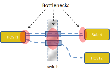 In a distributed system there are potential sources of bottlenecks. First of all, communication suffers if there is insufficient CPU time to delivery or retrieve messages. When using network protocols messages are queued on the network card and network switch. The situation is depicted in the figure below. Individual connections in YARP compete to get CPU time and network resources. When many components begin loading the available CPUs and using bandwidth performance may suffer.